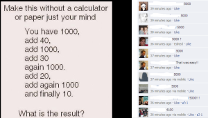 “Make this without a calculator or paper just your mind: You have 1000, add 40, add 1000, add 30, again 1000, add 20, add again 1000 and finally 10. What is the result?”